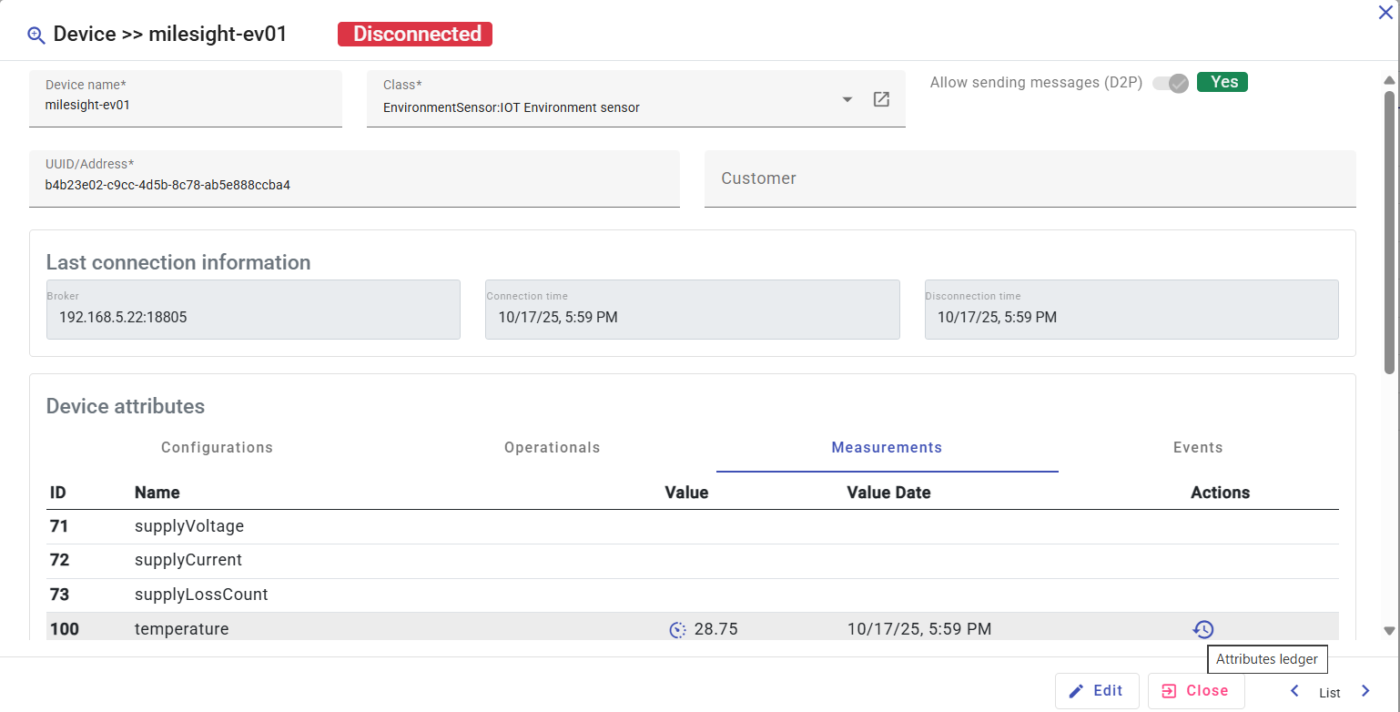 The information displayed on the list page includes the primary fields describing the device and its status — such as Device Name, Device Class, current connection status, ability to send messages to the platform, and the associated customer entity (if any). The other information like attributes and measurement ledger can be view when display a device detail page.