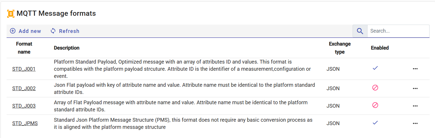 Several standard formats are provided with the initial installation. They are optimized for optimal and fast exchange. The administrator can modify them to suit his needs or add others. The screenshot below shows some formats with their descriptions. By enabling or disabling formats, we can control their use by brokers. Formats can be of JSON exchange type, XML or Protobuf.