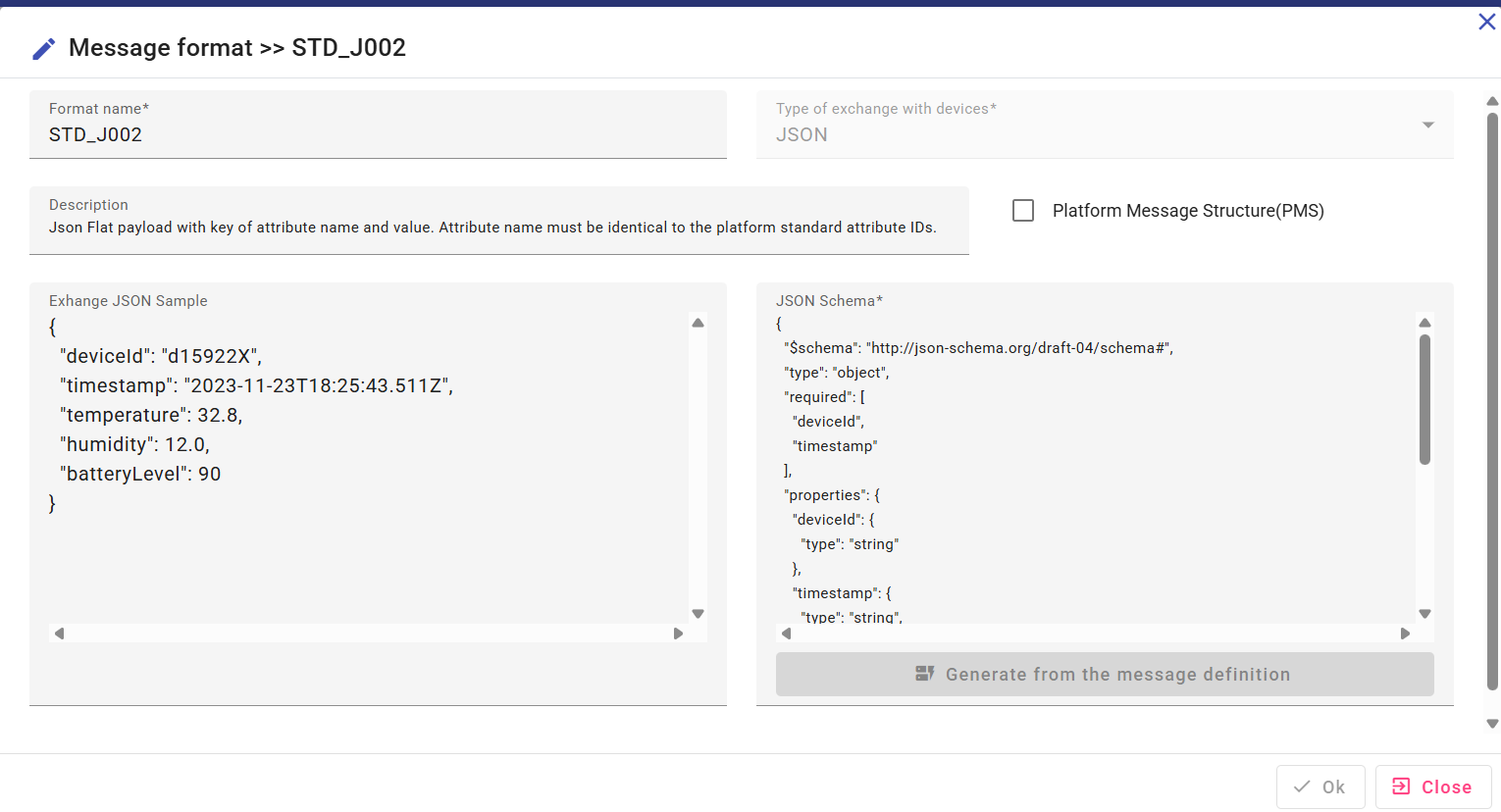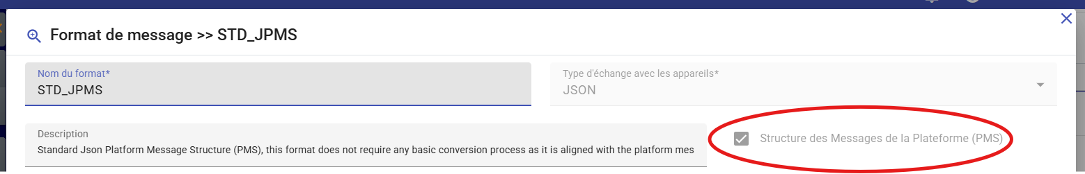 Creating a message format with the PMS box checked means that the message is aligned with the default structure on the platform side. Therefore, no conversion is necessary and the message acquisition will be smooth and optimized. PMS messages can be of type Json, Proto or XML.