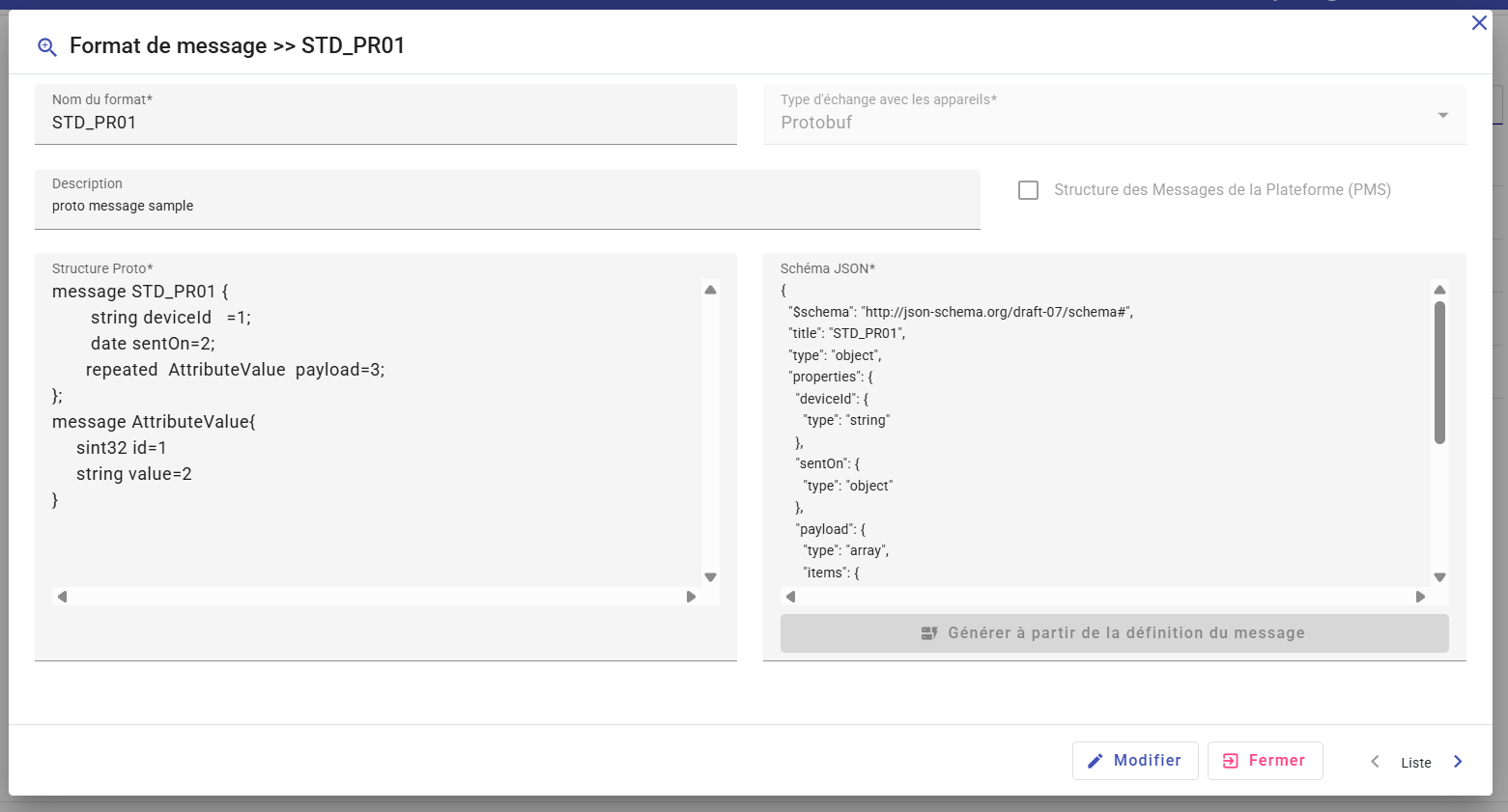 - Message definition : Proto structure for protobuf type or an example message for JSON or XML types.