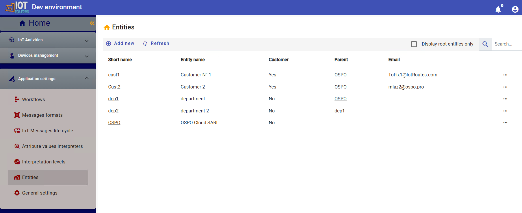 Accessible from Application Settings >> Entities, the screen below allows you to view and manage the list of entities.