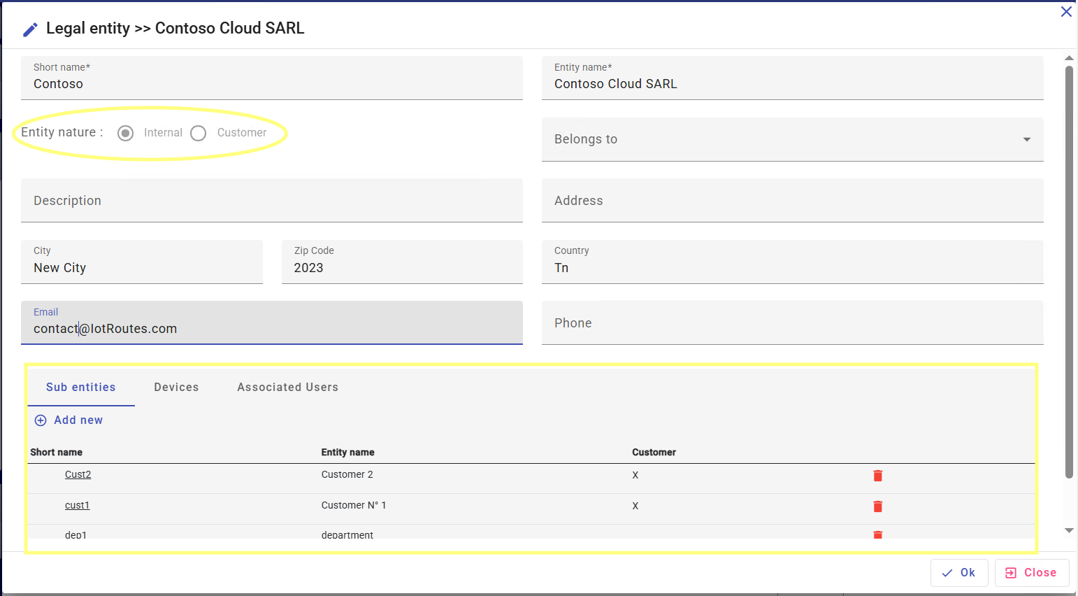 Entities in IoTRoutes are hierarchical in structure and represent groups, divisions, or individuals, and are divided into two categories: internal (such as subsidiaries, departments, or services) and external (usually customers).