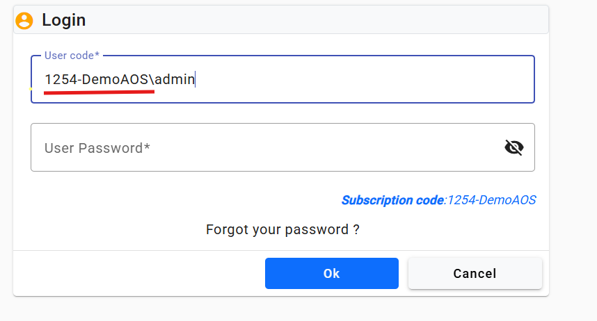 If you don't receive the notification, the default account is usually admin and the password is the one you entered in the configuration file appsetting.json or admin1 (see chapter On-premise AOS Installation). After the first login you should change the password by clicking on your account icon in the top right area of the screen.